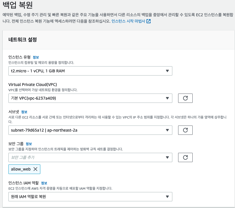 - 인스턴스 유형, VPC, 서브넷, 보안 그룹 선택