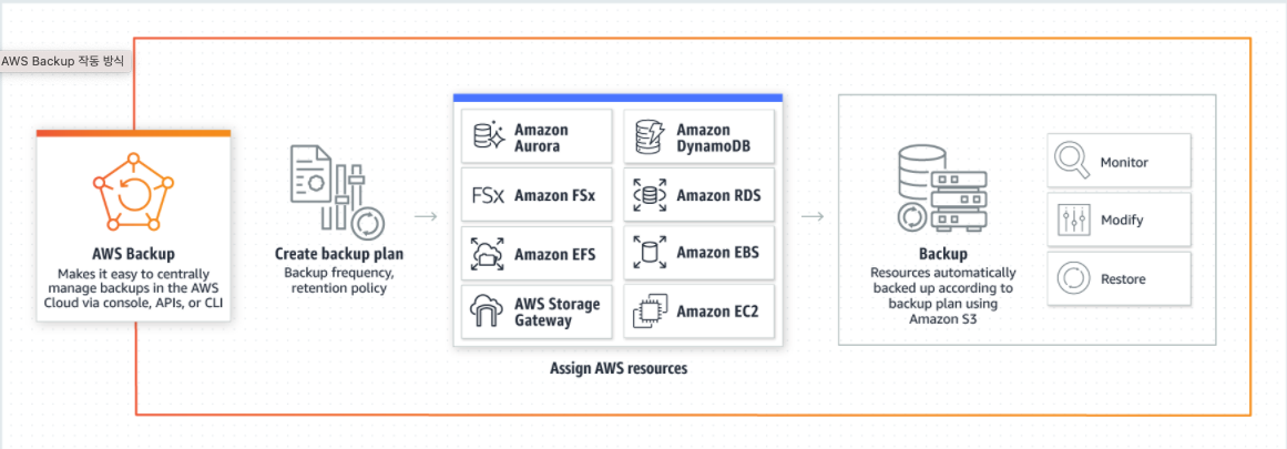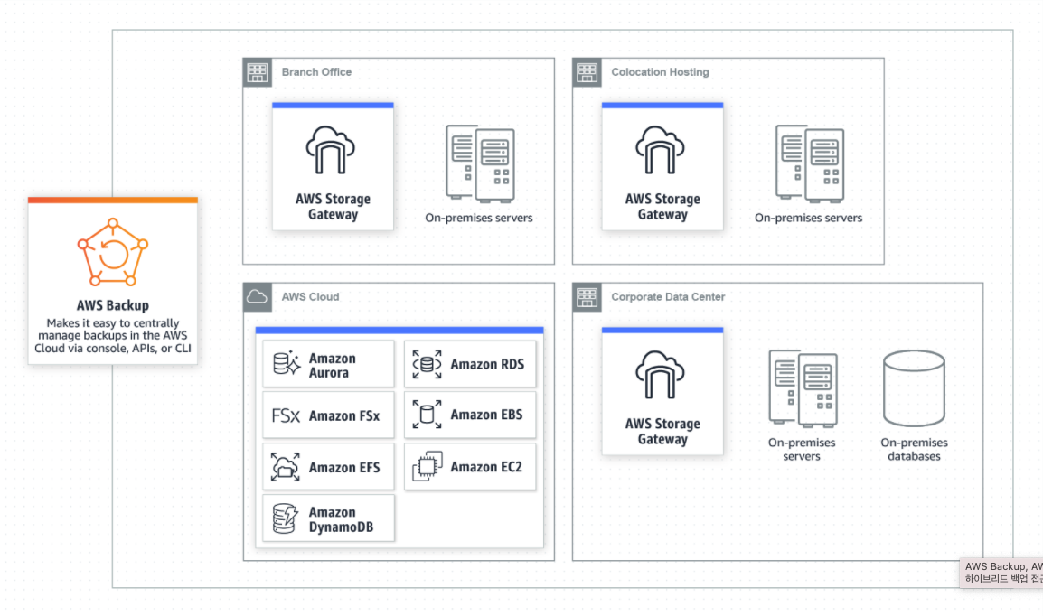 - AWS Backup이란 AWS 서비스를 백업 및 복구를 관리 할 수 있는 중앙 콘솔