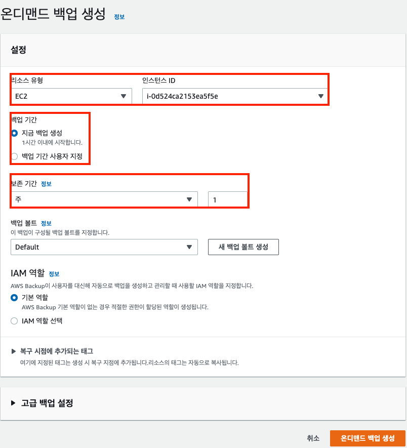 - 백업 볼트 : 백업이 구성될 백업 볼트 지정