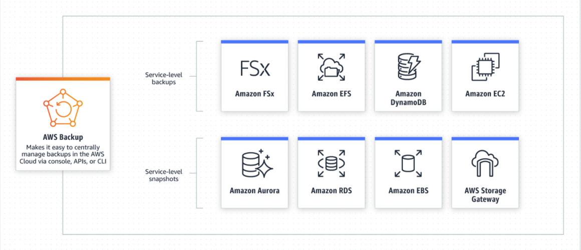 - Amazon EBS, Amazon RDS, Amazon DynamoDB, Amazon EFS, Amazon FSx, Amazon EC2 및 AWS Storage Gateway를 지원하므로, 스토리지 볼륨, 데이터베이스 및 파일 시스템과 같은 주요 데이터 스토어를 백업 가능