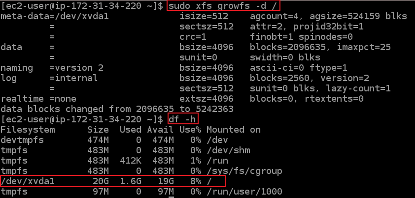 sudo growpart /dev/xvda 1 ##growpart 파티션 용량 증설
