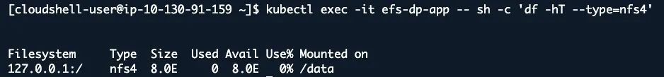kubectl exec -it efs-dp-app -- sh -c 'df -hT --type=nfs4'