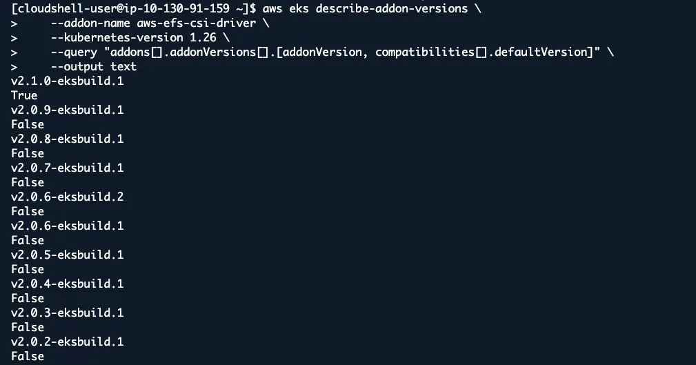 --query "addons[].addonVersions[].[addonVersion, compatibilities[].defaultVersion]" \