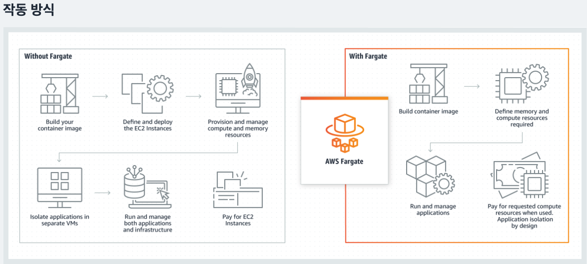 - 기존 ECS를 사용 하기 위해서는 EC2 Instance 설치 후 Cotainer 엔진 설치하여 필요한 이미지 설치하여 관리 필요