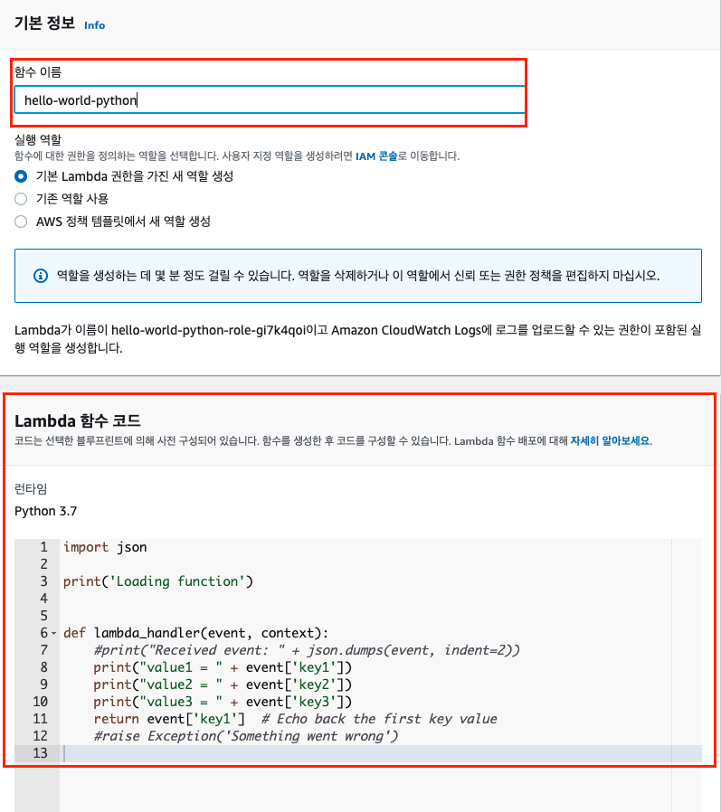 - 함수코드는 최대 15분 동안만 실행 가능하며 1초 ~ 15분 사이 값으로 설정 가능