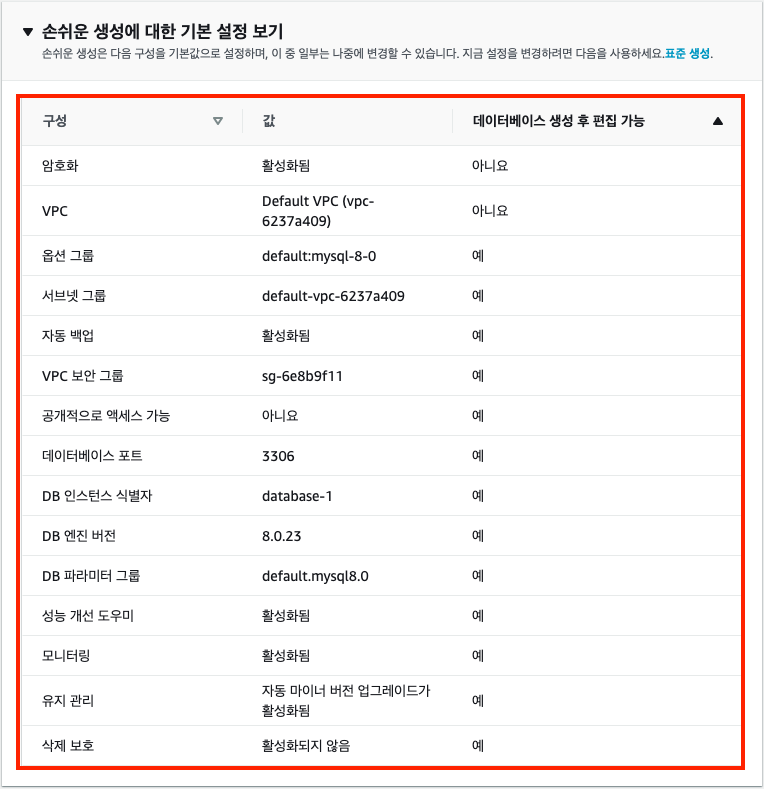 - AWS RDS 생성하는게 목적이라, "손쉬운 생성"을 통하여 권장 사례대로 구성하도록 하겠습니다. 옵션들에게 상세하게 선택하고 싶을 경우에는 "표준 생성"으로 하시기 바랍니다.