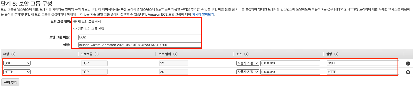 - 보안 그룹 구성 : 허용할 포트, 프로토콜 지정(정책에 맞도록 설정하시면 됩니다)