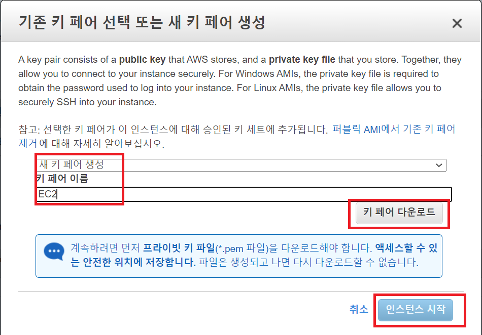 - 기존 키페어 선택,새 키페어 생성,키 페어 없이 계속