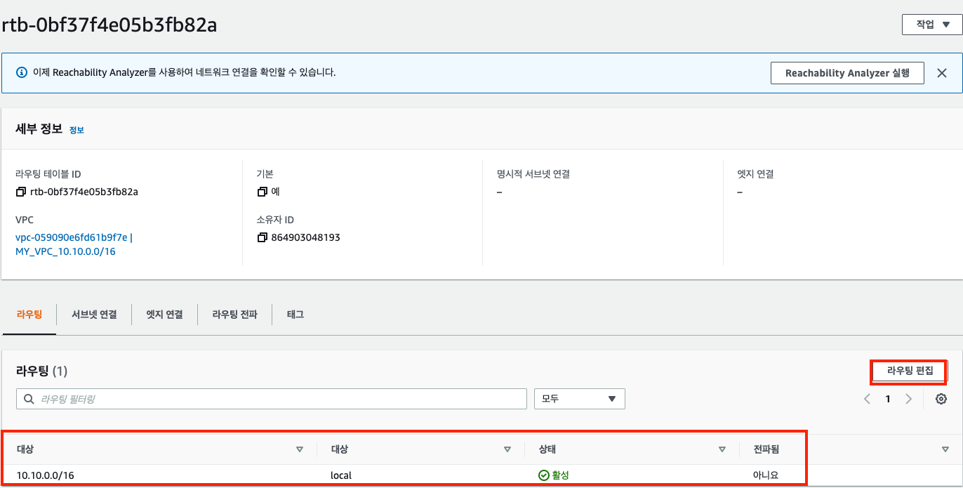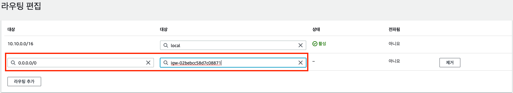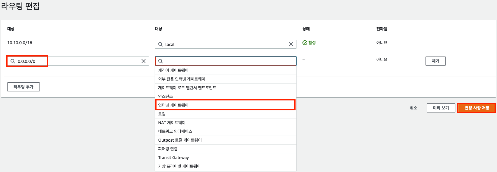 - 0.0.0.0/0 -> 인터넷 게이트웨이