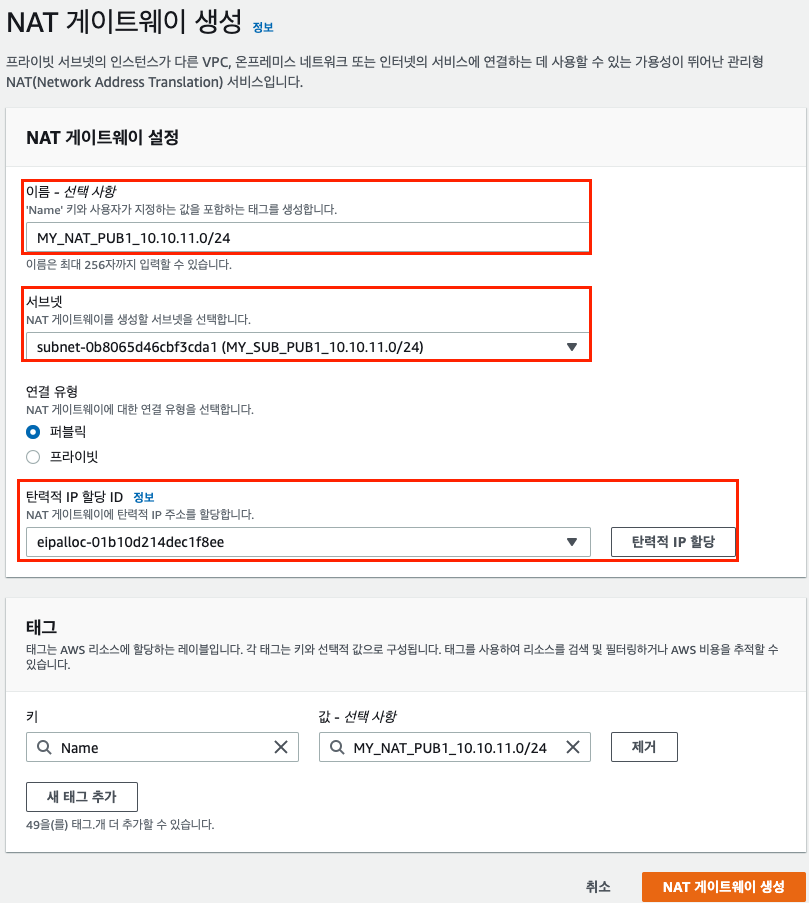 NAT Gateway는 Public zone 위치하여 private Zone에 위치한 대상들이 NAT Gateway를 통해 외부 에 접속 할 수 있도록 구성