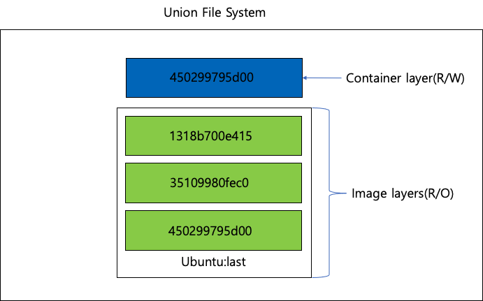 - 그림과 같이 이미지 레이어 3개, 컨테이너 레이어 1개로 되어있지만, 모든 레이어가 준비가 되면 유니온 파일 시스템을 사용하여 여러개의 레이어를 하니의 파일 시스템으로사용 할 수 있게 해준다.