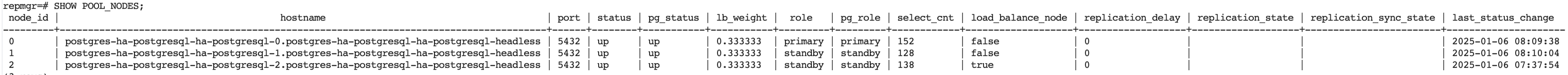 - 기본적으로 pgpool용 1개, 기본용 1개, PostgreSQL용 복제본 1개로 구성된 3개 노드가 있는 클러스터를 배포